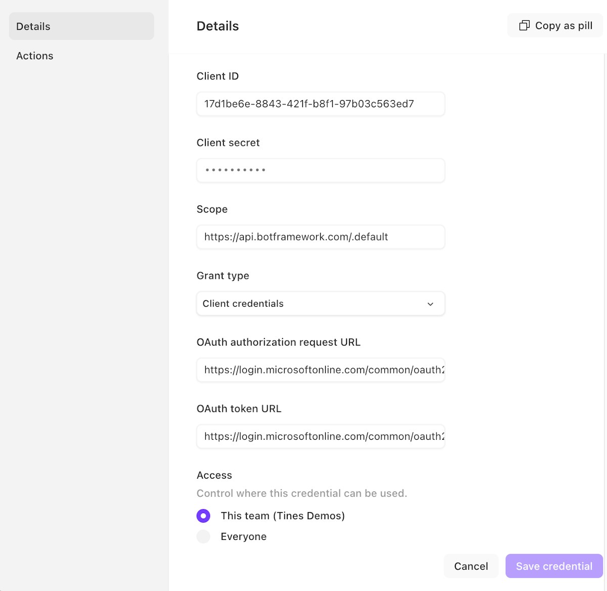 k) Access: Decide if you would like to make this credential available to everyone or only members of the specific Team within Tines.