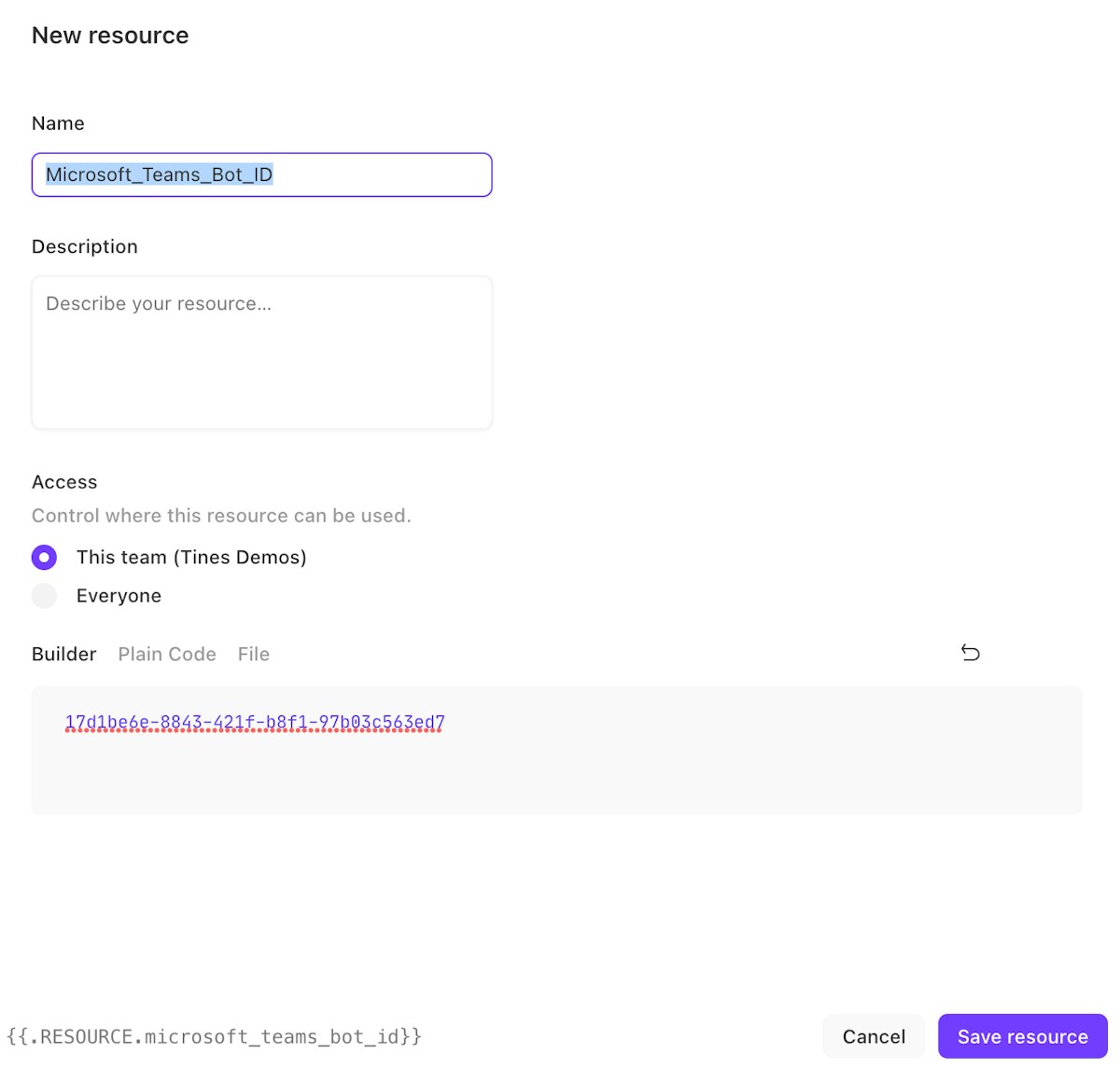 3. Create another resource identical to the step above (Name Microsoft_Teams_Bot_ID is used in the Story attached). The value should match the Bot ID from step 4 of the section 'Creating the Bot in Microsoft Teams.' Click "Save resource."