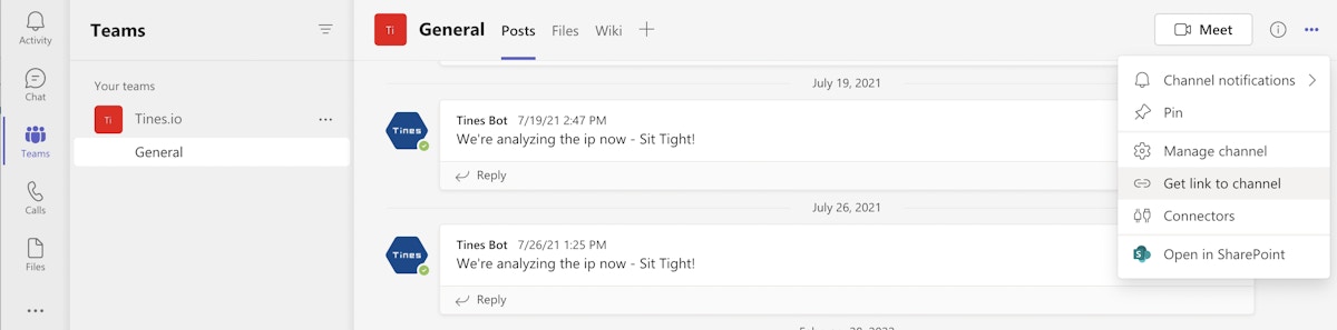 To do this, we created another resource (same steps taken in the "Setting up Resources in Tines" section above) in Tines named, "teams_tines_team_id." As stated in our previous blog, the Microsoft Team's teamId or internalId can be found within the Microsoft Teams UI. It is the parameter with the format guid@thread.MStool in the URL below: https://teams.microsoft.com/l/team/{{internalID}}/conversations/… The Team ID is also sent in all communications to the bot from the Team Chat within the Teams UI. This URL can be found by navigating to a team within Microsoft Teams and clicking on the three dots in the top right —> "Get link to channel."