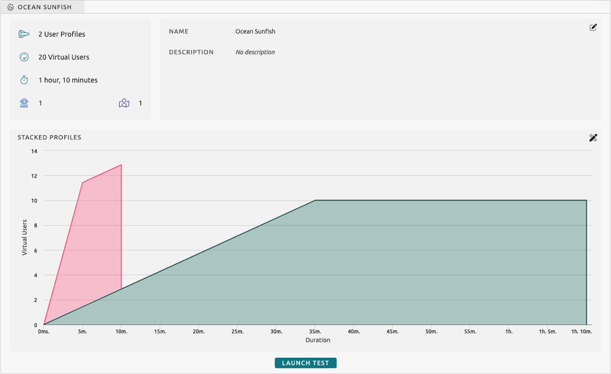 The virtual user count, test duration, ramp-up time, and peak load are all configurable to create a test that is tailored precisely for your goals.