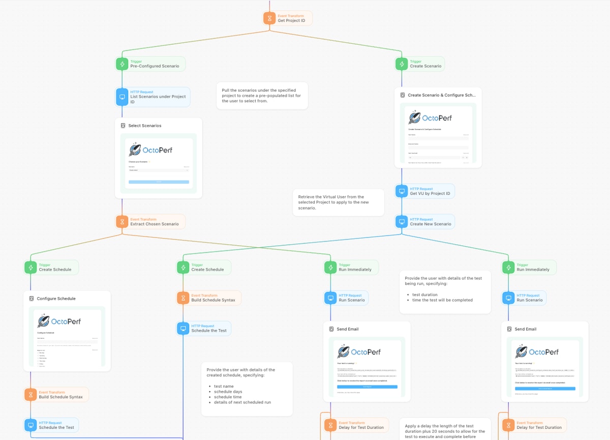 Tines’s versatility comes from its ability to integrate with any tool that offers an API. By combining Tines with the OctoPerf platform, Tines provides a streamlined way of automating the creation, scheduling, and execution of test scenarios and delivering the final analysis reports right to your inbox. In this blog, we will cover a story that does exactly that.