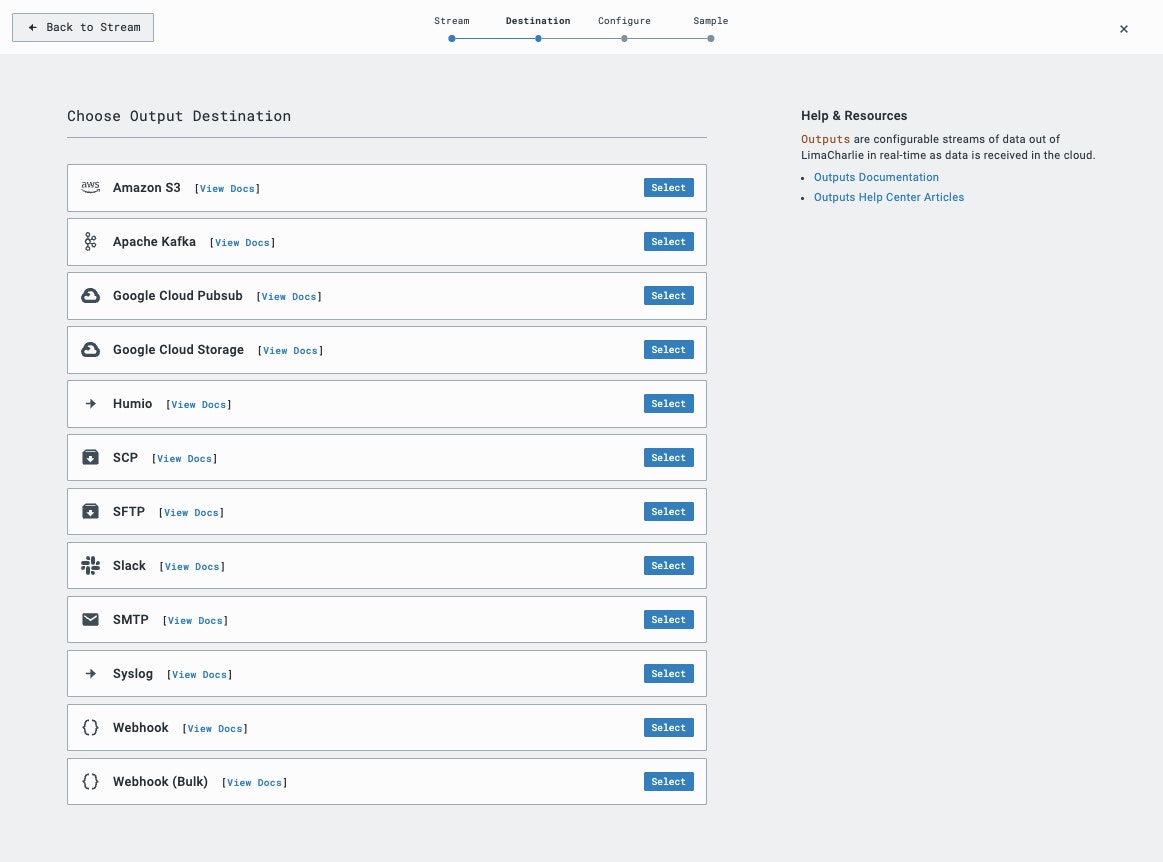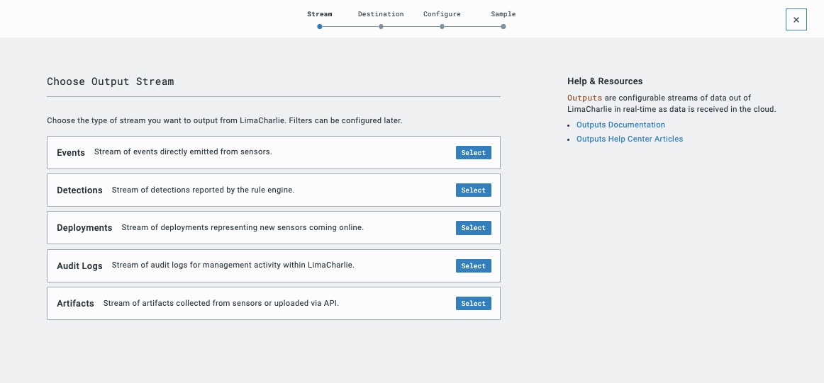 LimaCharlie offers several default streams of output telemetry, each of which can be further filtered through custom configuration. For this example, we are going to choose the Detections stream that will send event telemetry when detections from our Sigma rules set occurs.