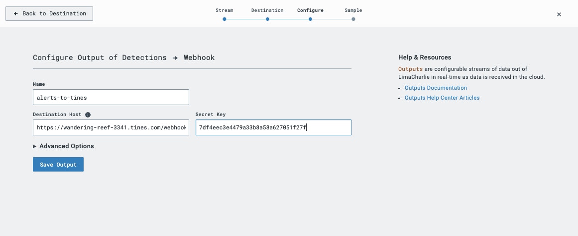 With Webhook selected, we will configure the Output. Give the Output a name that will remind you where the telemetry is going, then copy over the destination and secret from Tines.