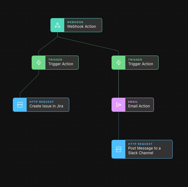 To create our high-level alert, we take a similar approach to what we did with setting up the Trigger for Jira, but this time we initiate an Email Action and an HTTP Request: Post Message to a Slack Channel.