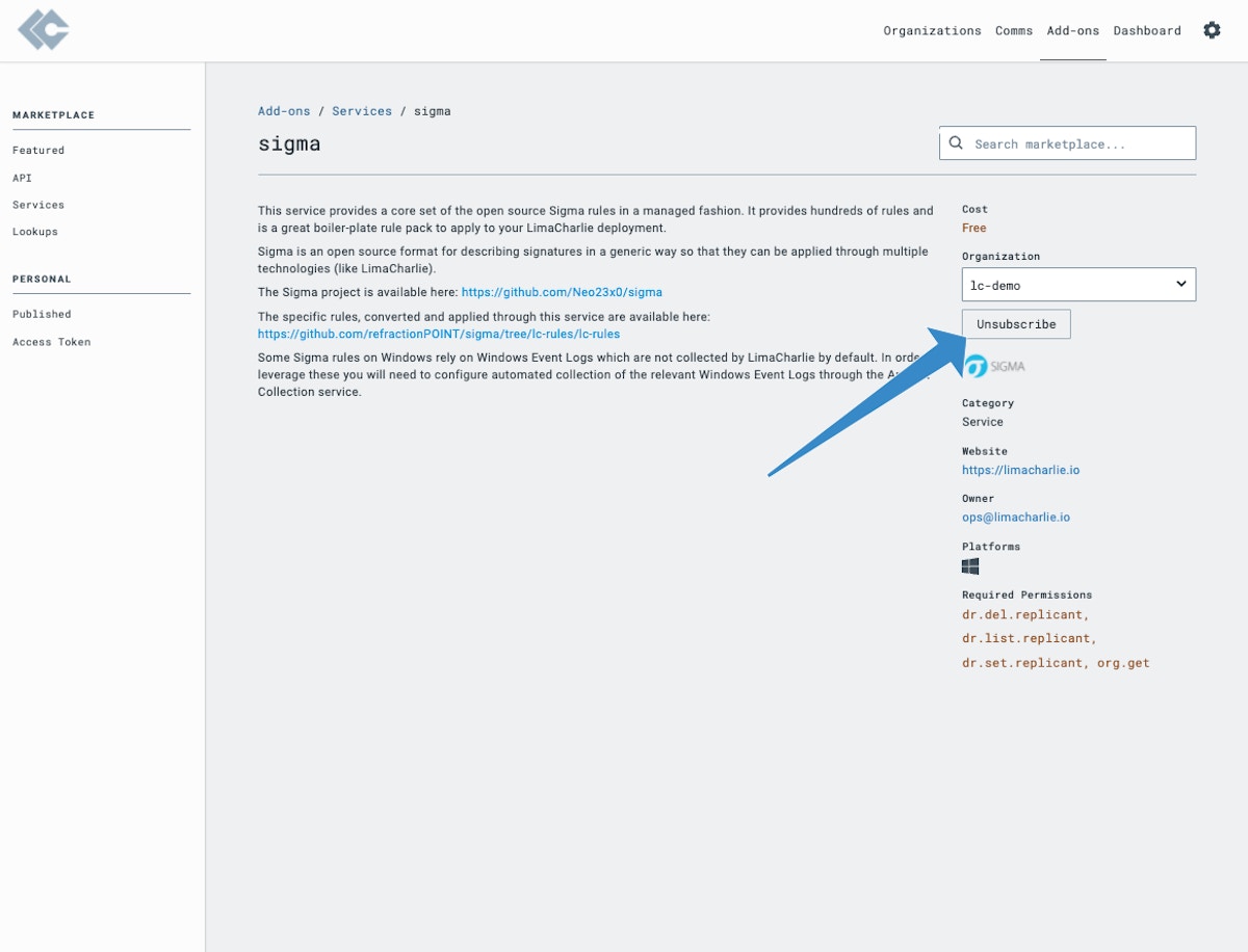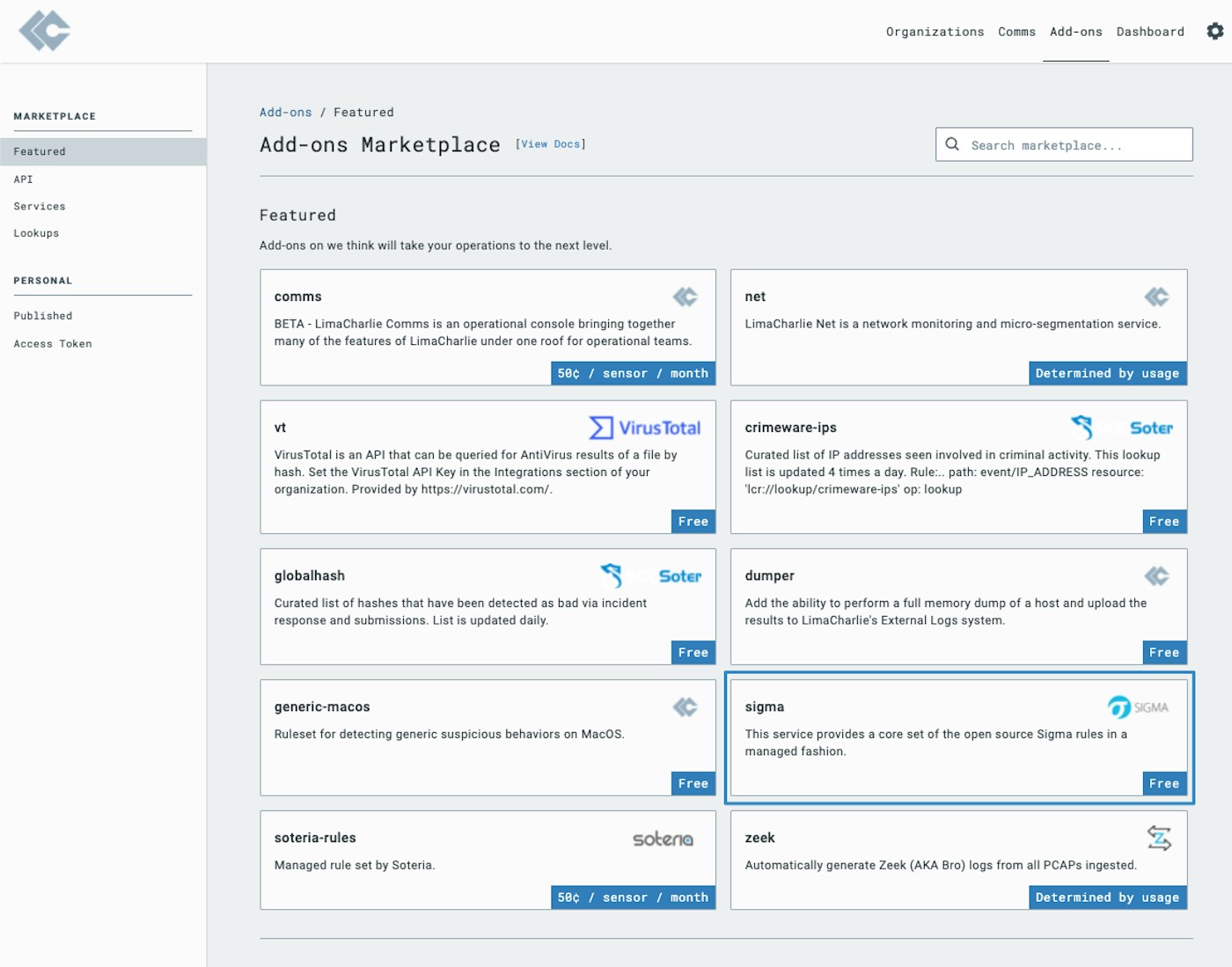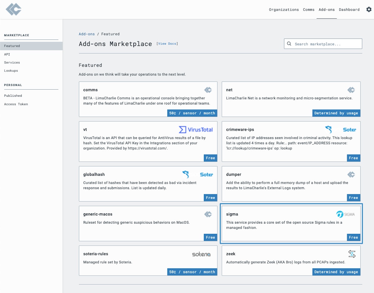 Assuming you already have endpoint sensors installed from LimaCharlie, you need to login into the web application and visit the add-on marketplace. Once in the Add-on marketplace, seek out the ‘sigma’ item and click on it. Once selected, simply click subscribe.