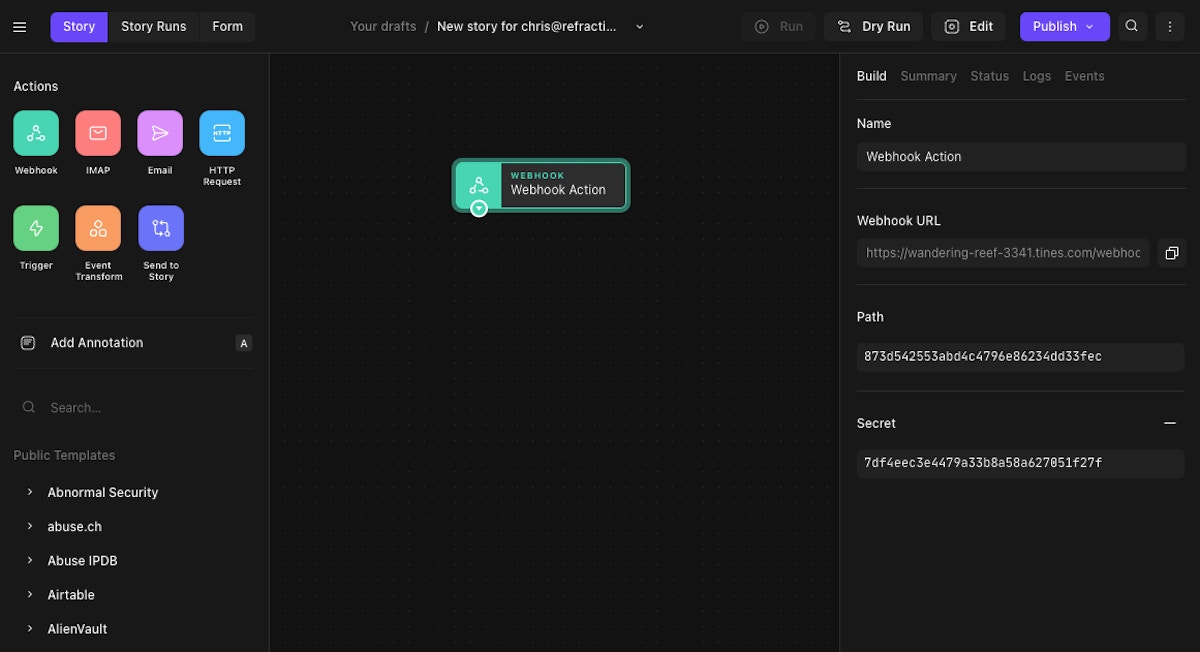 Inside of Tines, we are going to drag a Webhook Action onto our Storyboard, and then copy the Webhook URL and Secret from the right-hand menu.