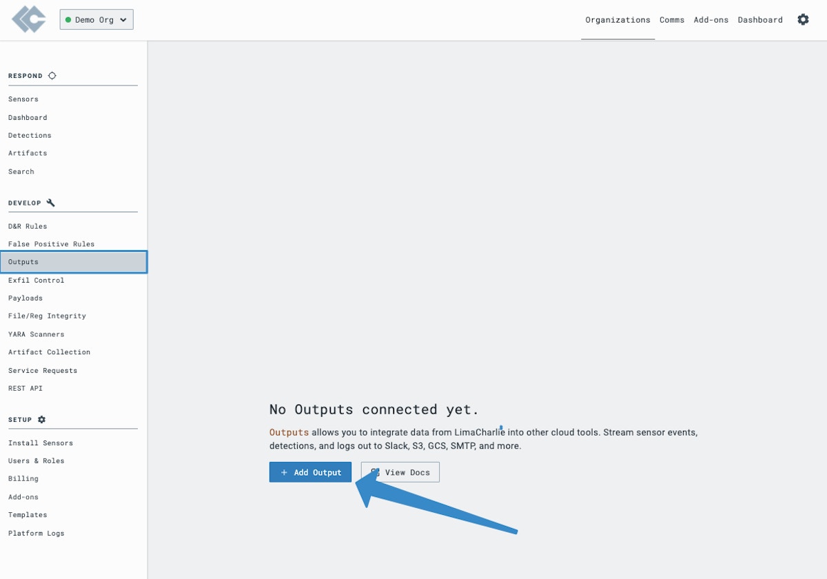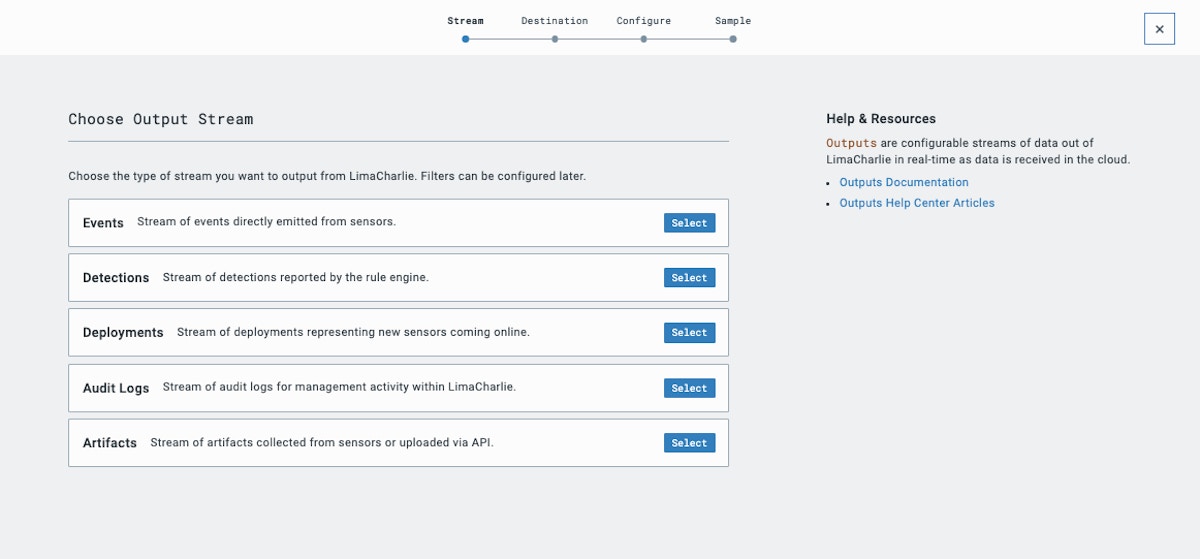 LimaCharlie offers several default streams of output telemetry, each of which can be further filtered through custom configuration. For this example, we are going to choose the Detections stream that will send event telemetry when detections from our Sigma rules set occurs.