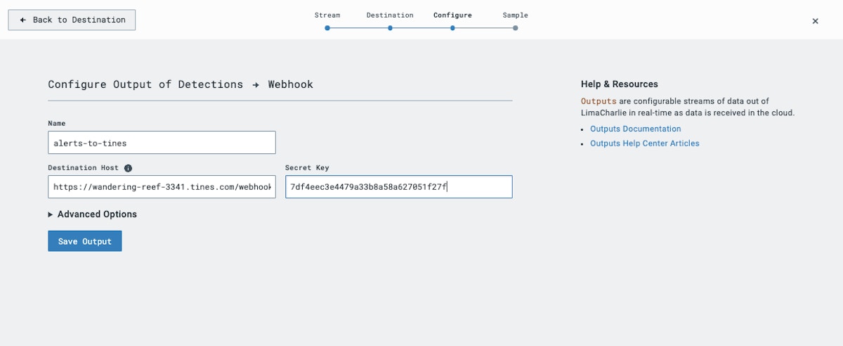 With Webhook selected, we will configure the Output. Give the Output a name that will remind you where the telemetry is going, then copy over the destination and secret from Tines.