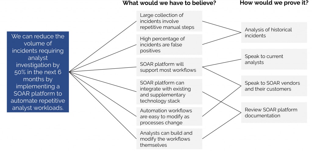 Although there are probably a few different ways to tackle this problem, let’s suppose you believe that the best way is by automating incident investigation and response using a security automation platform. Your hypothesis, therefore, is likely: