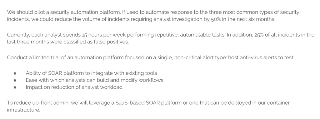 When you’ve completed your analysis and established insights that relate directly to the problem you’re aiming to solve, the final step is to package your proposal into a recommended solution. In this case, a comprehensive evaluation of a security automation platform you think is worth investing in.
