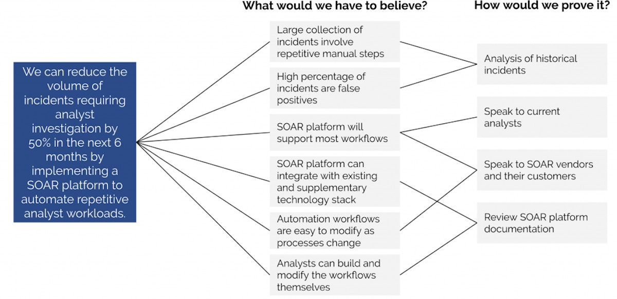 Although there are probably a few different ways to tackle this problem, let’s suppose you believe that the best way is by automating incident investigation and response using a security automation platform. Your hypothesis, therefore, is likely: