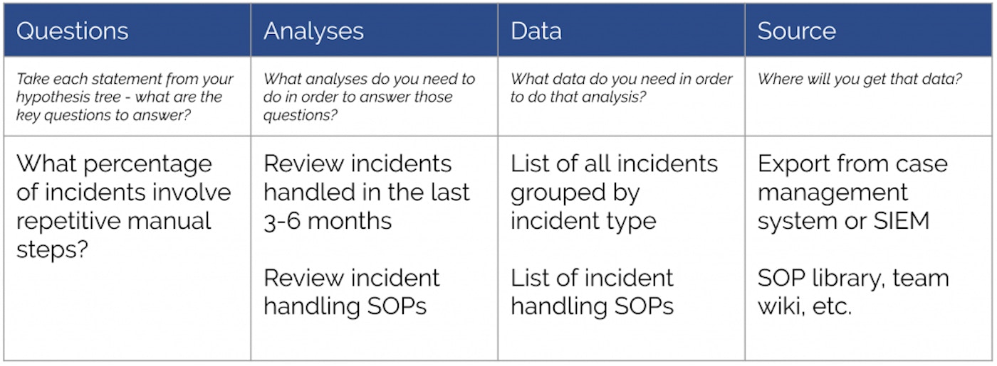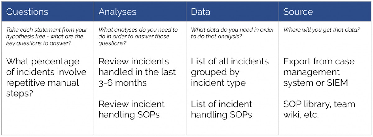 Now that we have our completed hypothesis tree, we need to perform an analysis to validate the supporting statements. For each statement, write down the corresponding question(s) you need to answer to prove that statement is true or false. Next, define the analysis you need to perform to answer that question. The analysis can be quantitative (counting repetitive steps in security processes) and qualitative (speaking to analysts). Finally, what data do you need to support the analysis, and where will you find it?