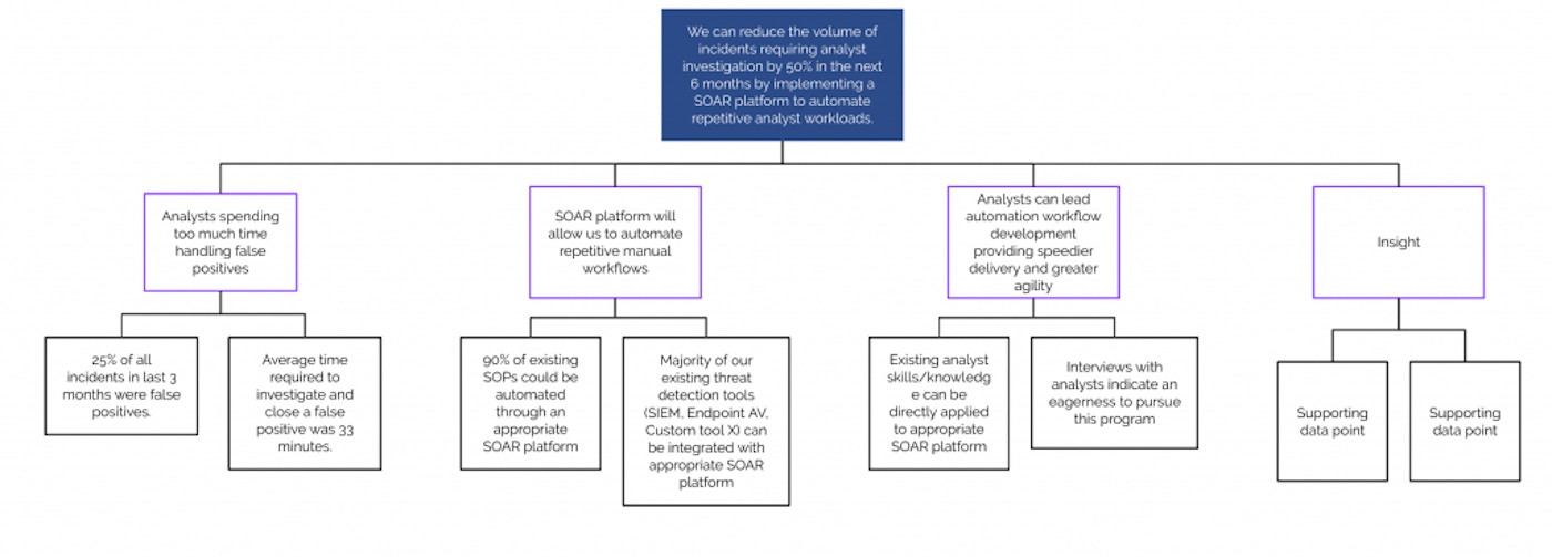 We can reduce the volume of incidents requiring analyst investigation by 50% in the next six months by implementing a SOAR solution to automate repetitive analyst workloads.