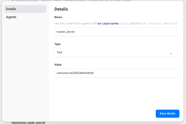 You'll also notice, that we're able to reference another credential, our TruStar secret, in the HRAC. We can store that secret separately so it doesn't appear in the HRAC and we can rotate that credential separately if needed.