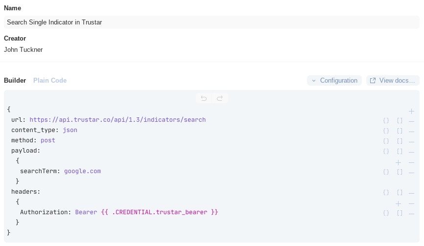 Once the HRAC is set up, we can use it like we would any other credential in actions on the Tines Storyboard. In the below example, we use the token to authorize a call to TruStar's indicator search.