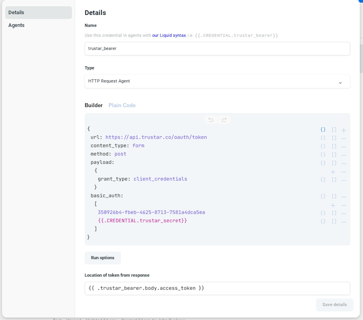 We've created an HRAC that will request a token from TruStar when we give it some authentication parameters. Using "Run Options", the HTTP request above will be made and then results will be shown. Then we can identify where the authentication token is in the "Location of token from response" field, referencing fields of the response like on the Tines Storyboard.