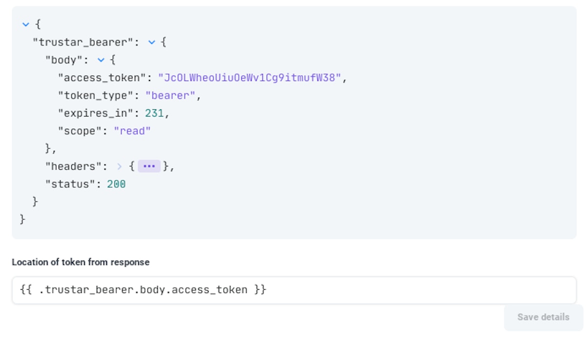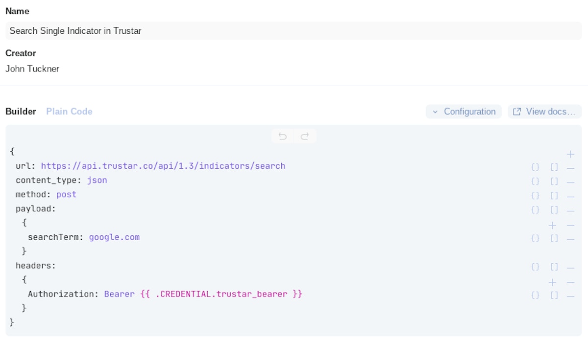 Once the HRAC is set up, we can use it like we would any other credential in actions on the Tines Storyboard. In the below example, we use the token to authorize a call to TruStar's indicator search.