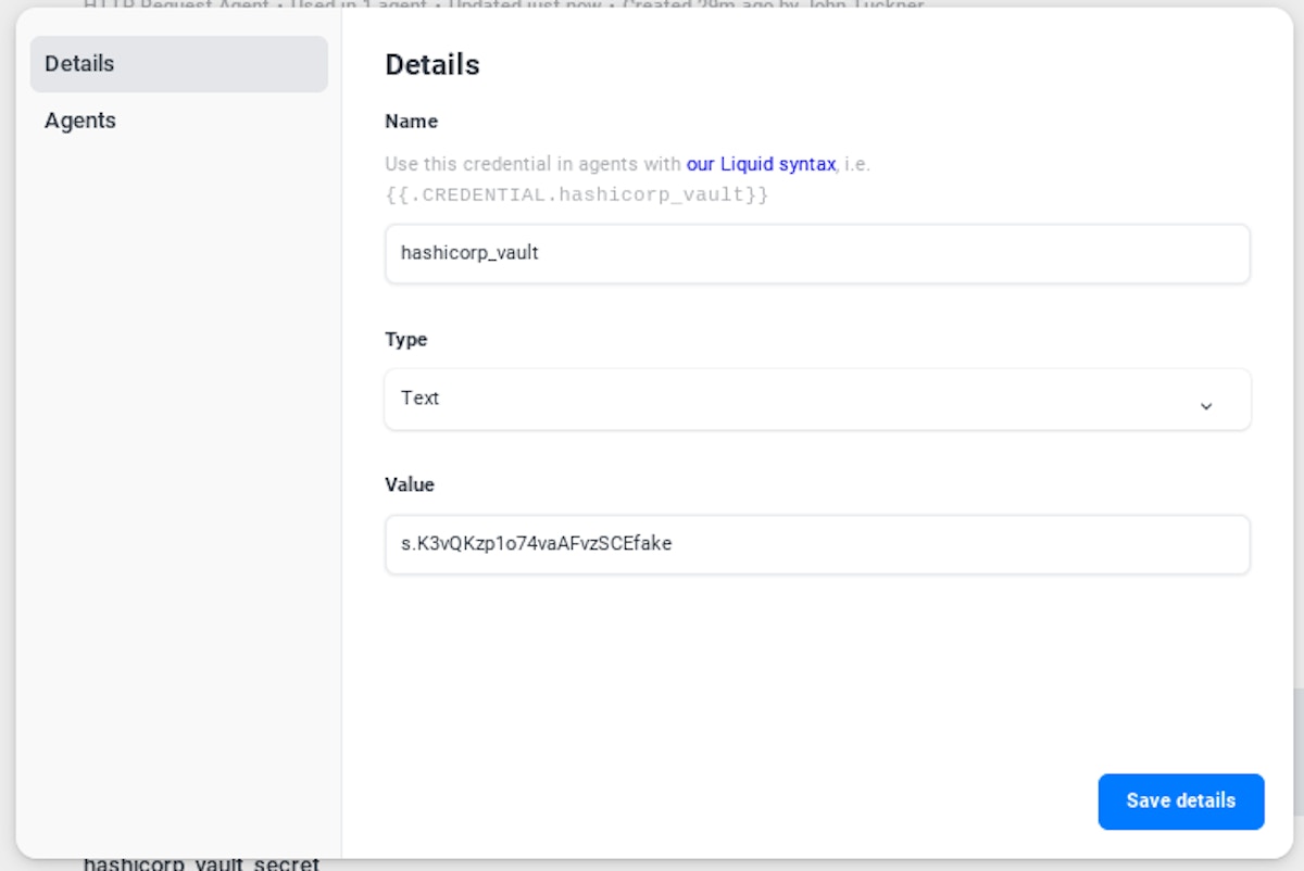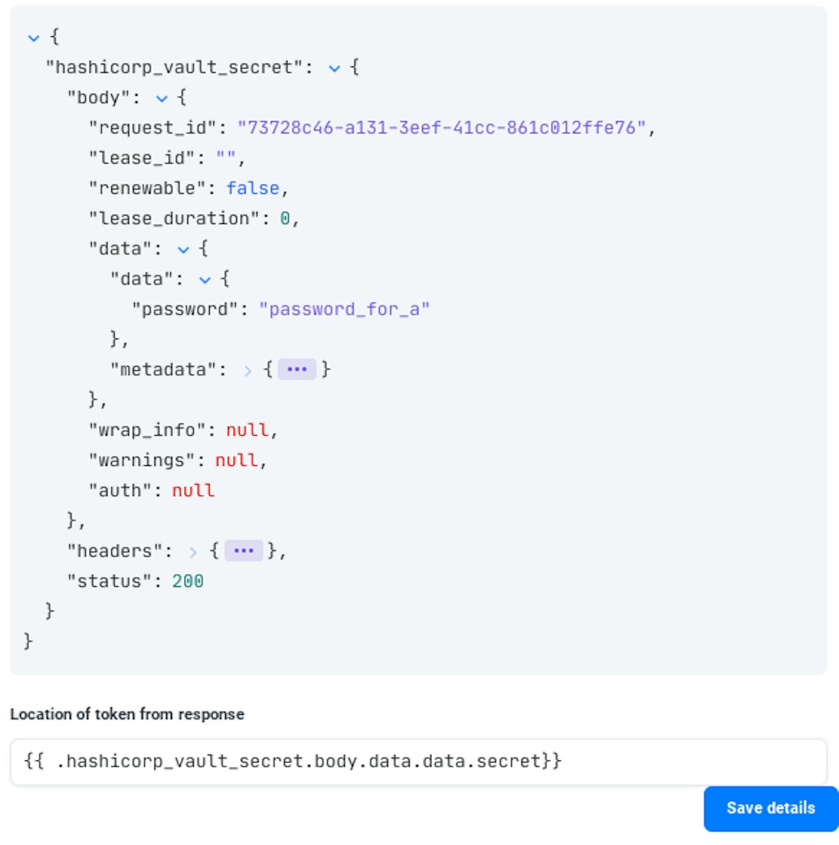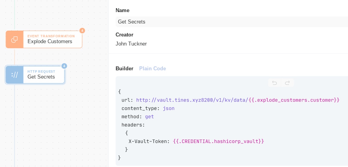 We'll again create a basic text credential with the token we need to access the vault. Then, we'll create an HRAC to access HashiCorp Vault to get a secret stored there in its key/value storage. In this example, we'll get the secrets for a single customer named "customer_a":