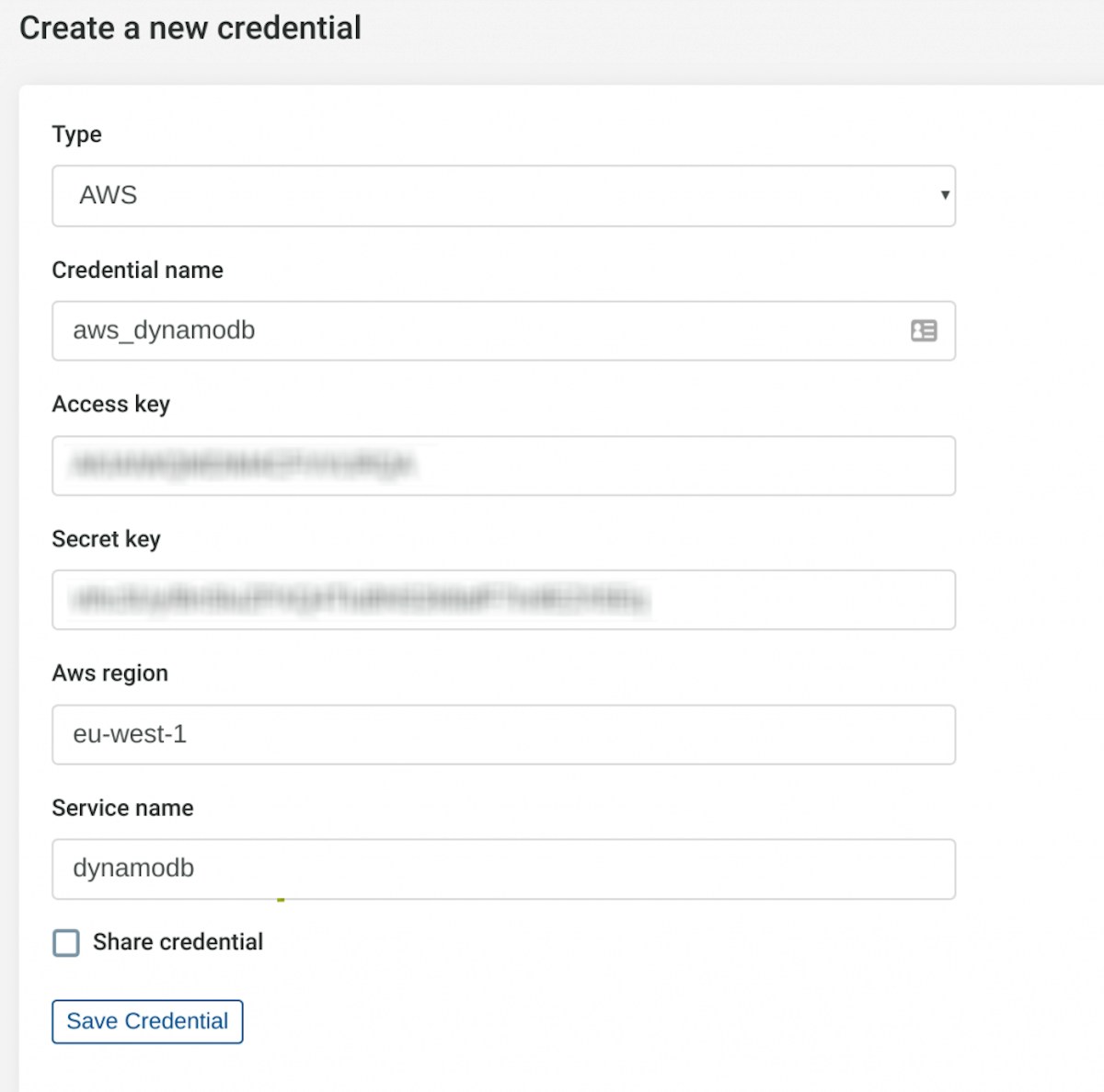 Next, specify a name for the credential and choose the AWS region you will be working with. Finally, under service name enter ‘dynamodb’.