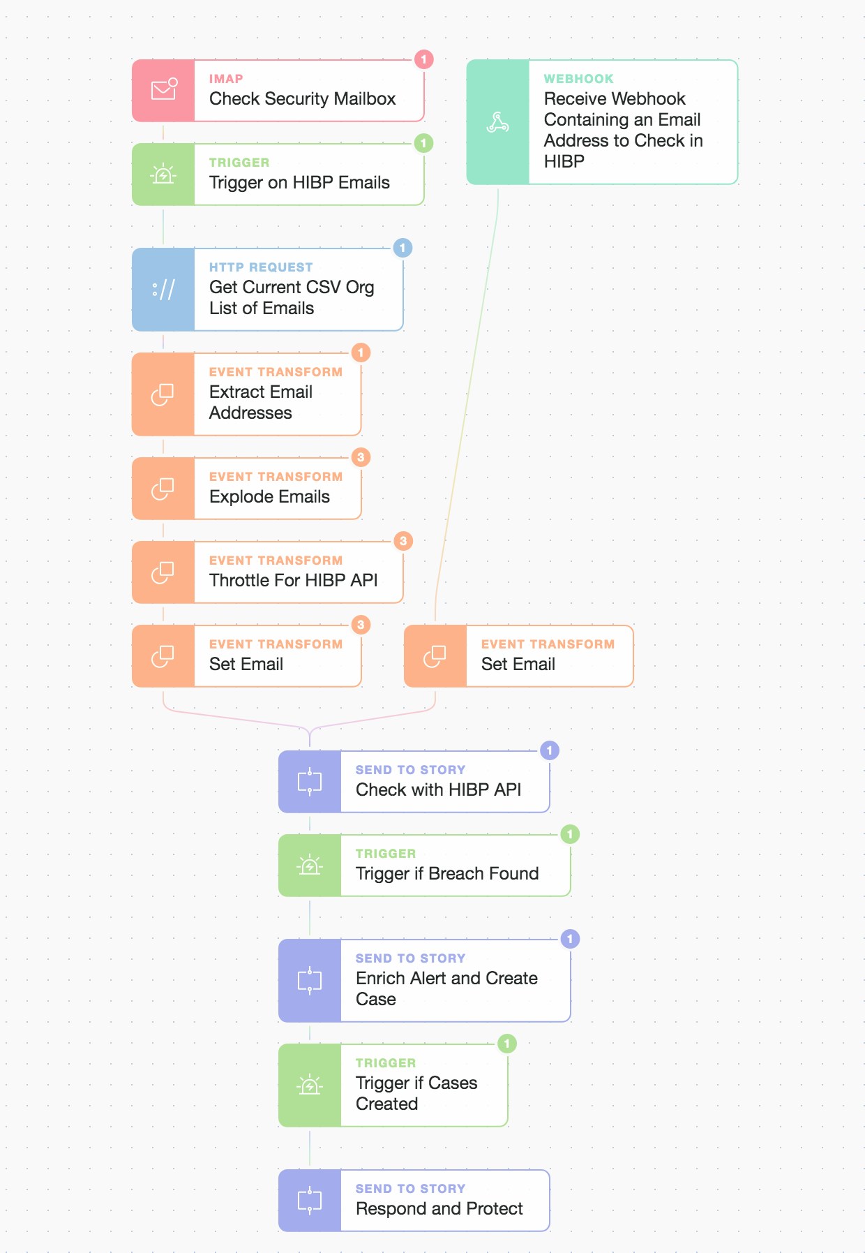 In Part 1, we looked at how to use the HaveIBeenPwned (HIBP) Domain Search service as a trigger to initiate our automation (with an additional and optional webhook approach). Now, in part 2 we will again use the HIBP API but also other services to enrich our understanding of the impact. We then go on to automate case creation for both Helpdesk and Infosec or SecOps teams. As a reminder, we are now on the “Enrich Alert and Create Case” stage of the below parent automation. We’re also using the modular “Send To Story” Action to simplify our workflow and enable simple extensibility. For any other use cases or steps you’d like to see, why not ask us in chat!