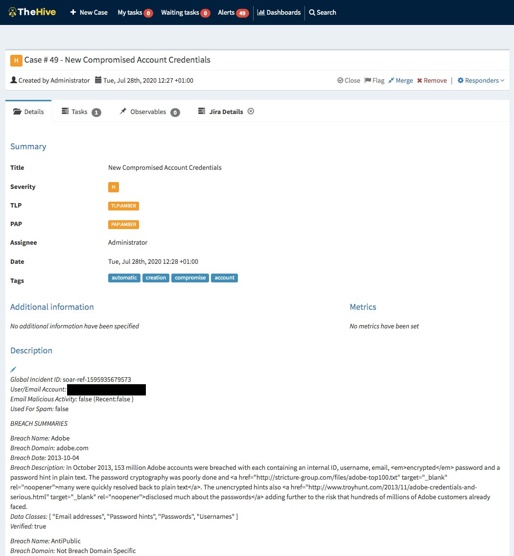 }...We then summarize the main points including the DataClasses involved. Additionally, we check if the breached email has been seen or used elsewhere on the Internet by using the emailrep.io service. All this is then also neatly packaged up into our case creation.