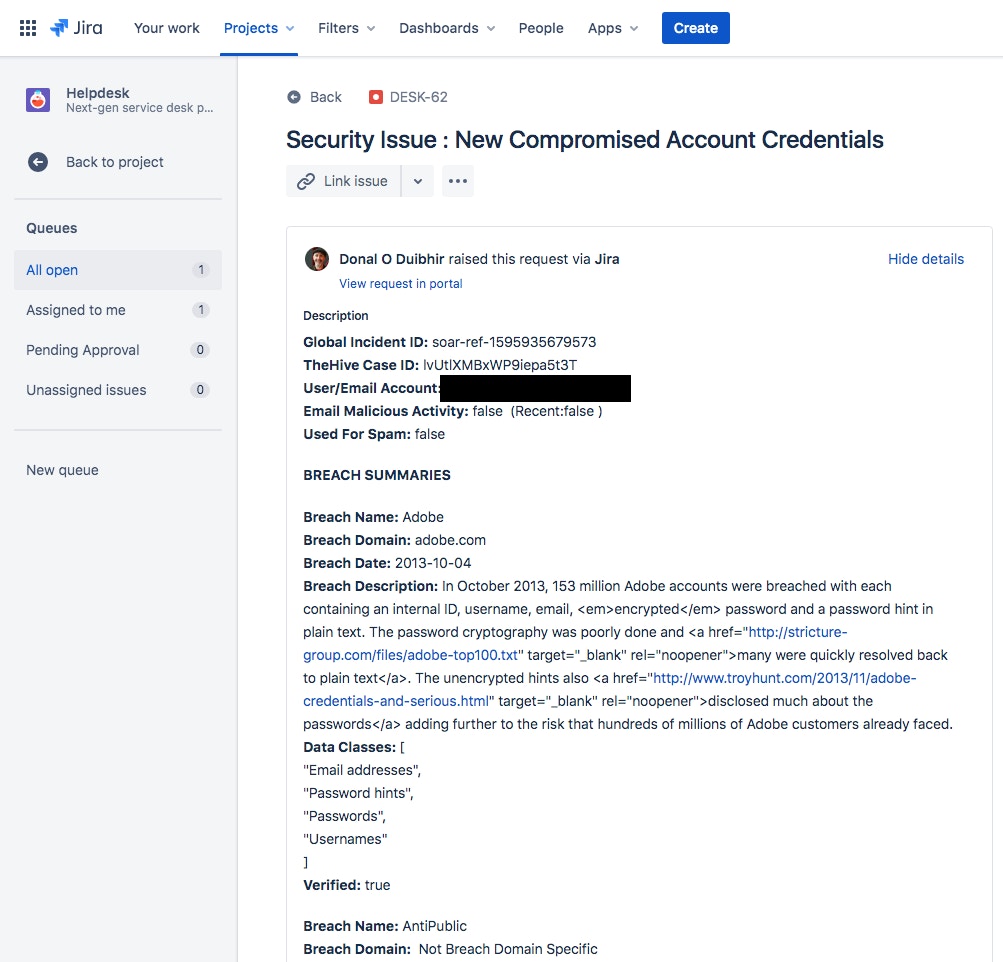 Every organization also has its own preferred business processes and workflows around case management. Here we will create an individual case per compromised account rather than batching accounts per breach and then including them in a single case. This approach is also possible but would require a few amendments to the current workflow. Here we are assuming a low number of breached accounts with each being treated as its own incident, especially for allocating and tracking Helpdesk tasks.