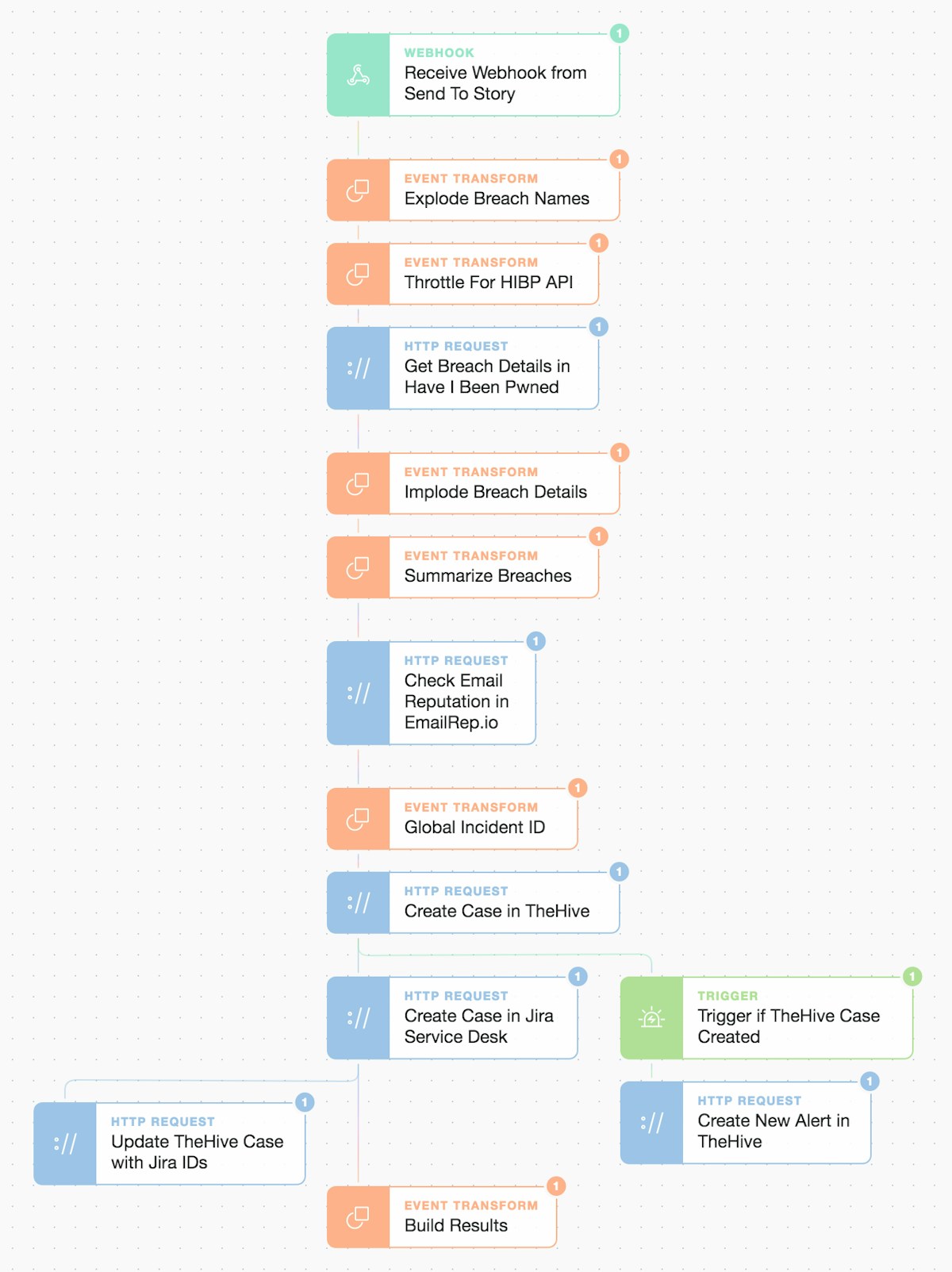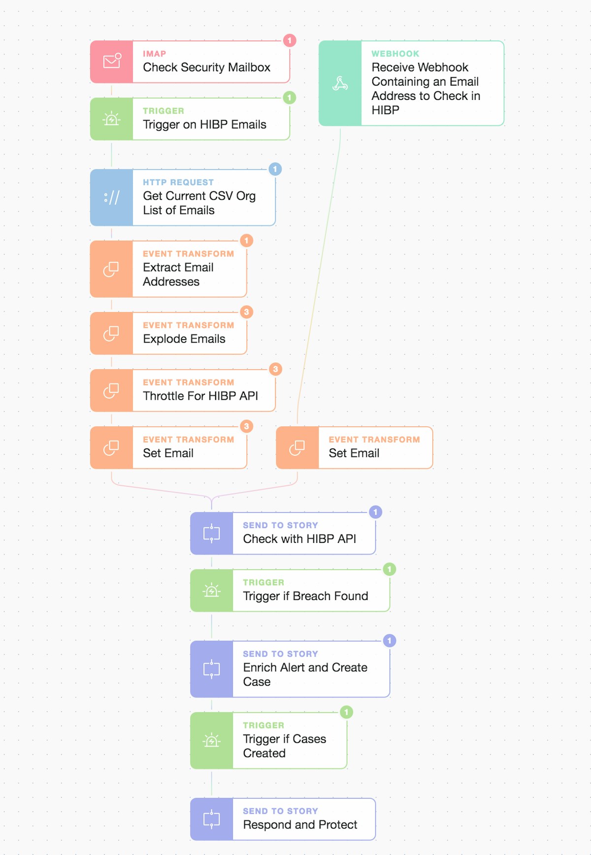 In Part 1, we looked at how to use the HaveIBeenPwned (HIBP) Domain Search service as a trigger to initiate our automation (with an additional and optional webhook approach). Now, in part 2 we will again use the HIBP API but also other services to enrich our understanding of the impact. We then go on to automate case creation for both Helpdesk and Infosec or SecOps teams. As a reminder, we are now on the “Enrich Alert and Create Case” stage of the below parent automation. We’re also using the modular “Send To Story” Action to simplify our workflow and enable simple extensibility. For any other use cases or steps you’d like to see, why not ask us in chat!