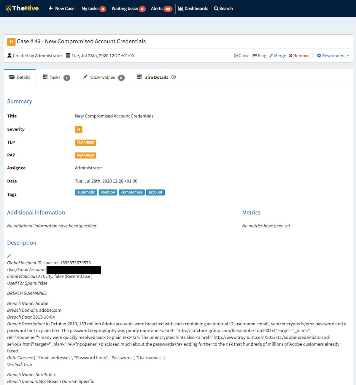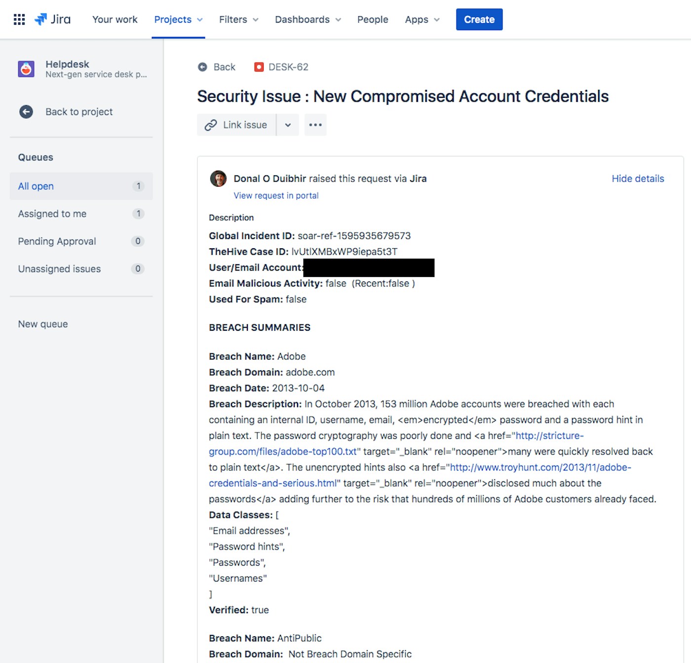 Every organization also has its own preferred business processes and workflows around case management. Here we will create an individual case per compromised account rather than batching accounts per breach and then including them in a single case. This approach is also possible but would require a few amendments to the current workflow. Here we are assuming a low number of breached accounts with each being treated as its own incident, especially for allocating and tracking Helpdesk tasks.