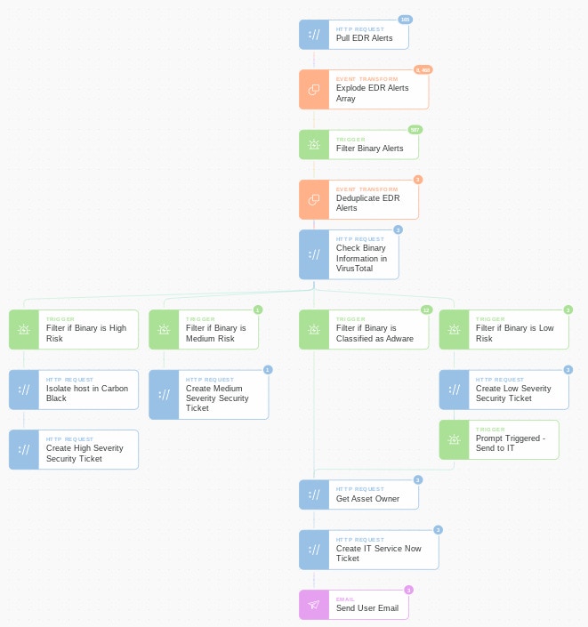 A good example of a simple enrichment flow that can be automated immediately (read more about it here) is a suspicious binary download detected by your Anti Virus, Firewall, or EDR tool. With Tines, it’s very simple for analysts to create a flow to first deduplicate and then enrich detections with binary information (from VirusTotal or elsewhere) to see exactly how dangerous the binary is and to take the workload off analysts if they’re classified as Unwanted or Adware. If the binary is classified as adware then Tines can automatically send the incident details to IT for remediation. Using this method we have seen analysts, with no coding background, automate a process in just a few hours that immediately freed up 10-20% of their time.