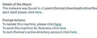 Prompt Actions within a ticket allow analysts to instantly isolate a machine or lock an account