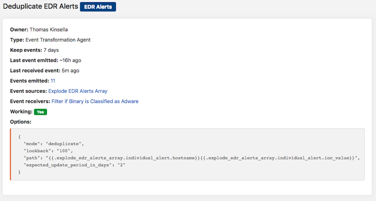 In the example below, we deduplicate alerts using an “Event Transformation Action” in Tines on the fields “Hostname” and “IOC Value” emitted from the “explode EDR alerts array” Action. This deduplication flow means the same indicator won’t alert on the same machine twice. Using a security automation platform to automate these steps helps minimize alert overload and, above all, helps keep your analysts focused on higher impact engineering efforts.