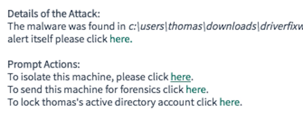 With Tines’ “Prompts” feature we enable responders to automatically take an action in any workflow by simply clicking a link. These Prompts can be launched from anywhere, for example in an incident ticket, in a text or email, in Slack, etc. They allow analysts to take the next step in an investigation without opening up different tools, contacting other teams, or leaving their environment. When a responder clicks a “Prompt” this re-releases an event in Tines and sends it down a new remediation workflow. These prompts super-charge analysts' responses.