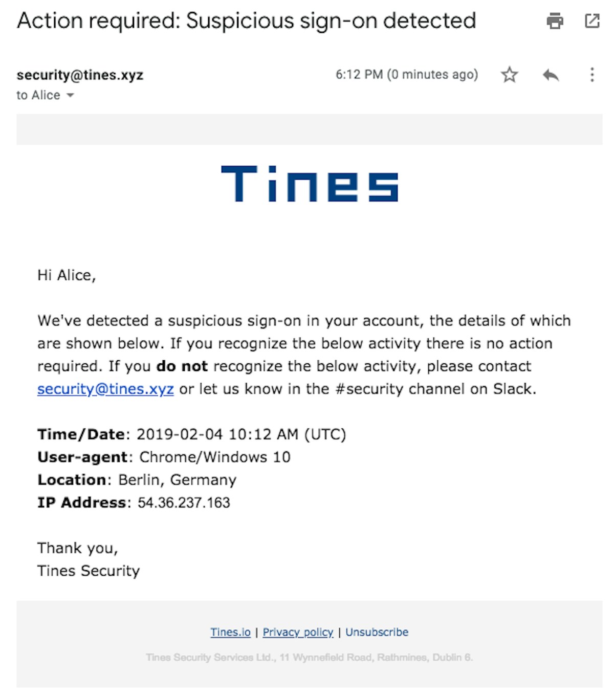 For example, as a small security team (or small company) with just a few security tools, it’s possible to investigate every suspicious VPN login or contact every new user provisioned export rights or admin rights. As the team expands and builds out higher-fidelity detections, however, these alerts become noisier and the ratio of true to false positive means it’s not practicable to follow up with all of them. Instead of turning off these alerts Tines takes these incidents, enriches them, and allows users themselves to detect potentially malicious activity.