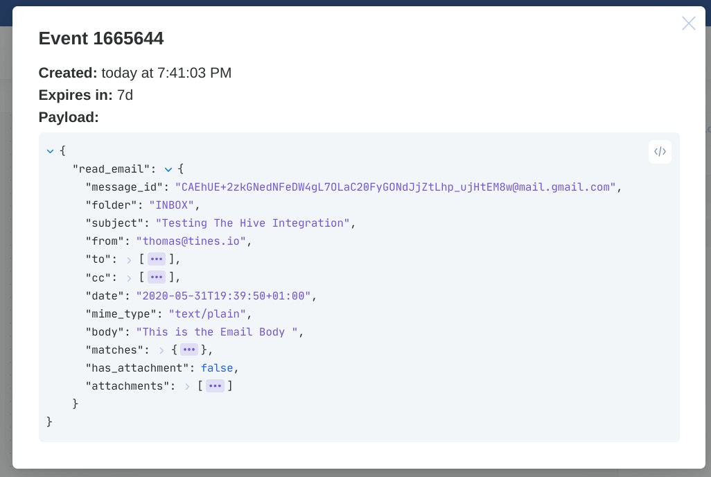 Congratulations! You’re now reading emails from your inbox in Tines. Tines will automatically check this mailbox every five minutes and emit a new event every time it detects a new email.