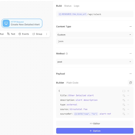Similar to our curl command above, this will send an alert to the alert endpoint of your TheHive instance with a title, description, source, sourceref, together with headers. Edit the Action with some sample text that you think is appropriate.