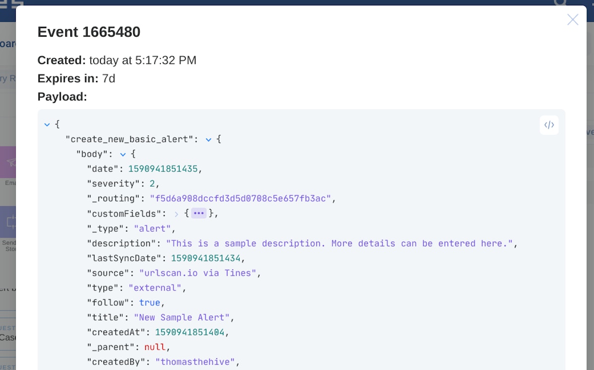 We can see in Tines that the alert has been successfully created by viewing the Event in the Events tab of the action properties panel.