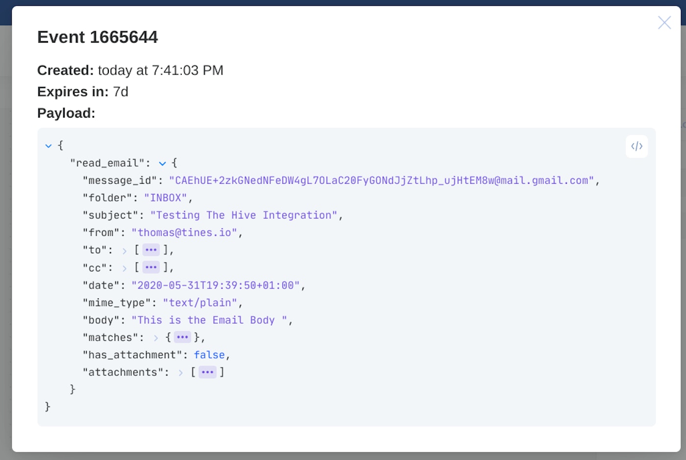 Congratulations! You’re now reading emails from your inbox in Tines. Tines will automatically check this mailbox every five minutes and emit a new event every time it detects a new email.