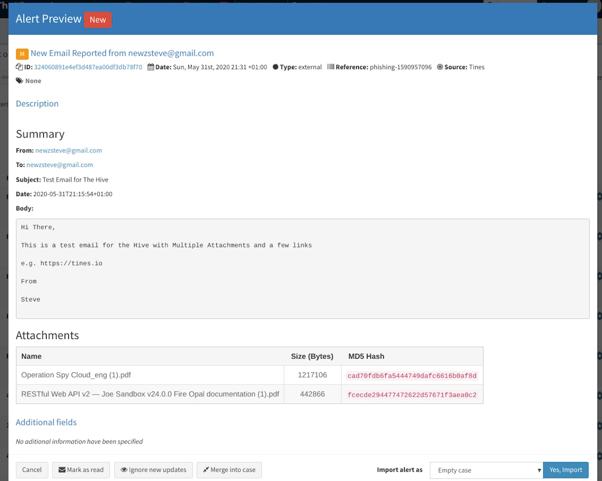 TheHive is a full-featured scalable, open-source, and free security incident response platform. Tines is a peer leader in security automation. Several large and small companies, including Auth0, use both Tines and TheHive to automate their Incident Response processes. In this blog, we’ll learn how to use the TheHive API together with Tines to automate the creation of alerts from phishing emails and more.