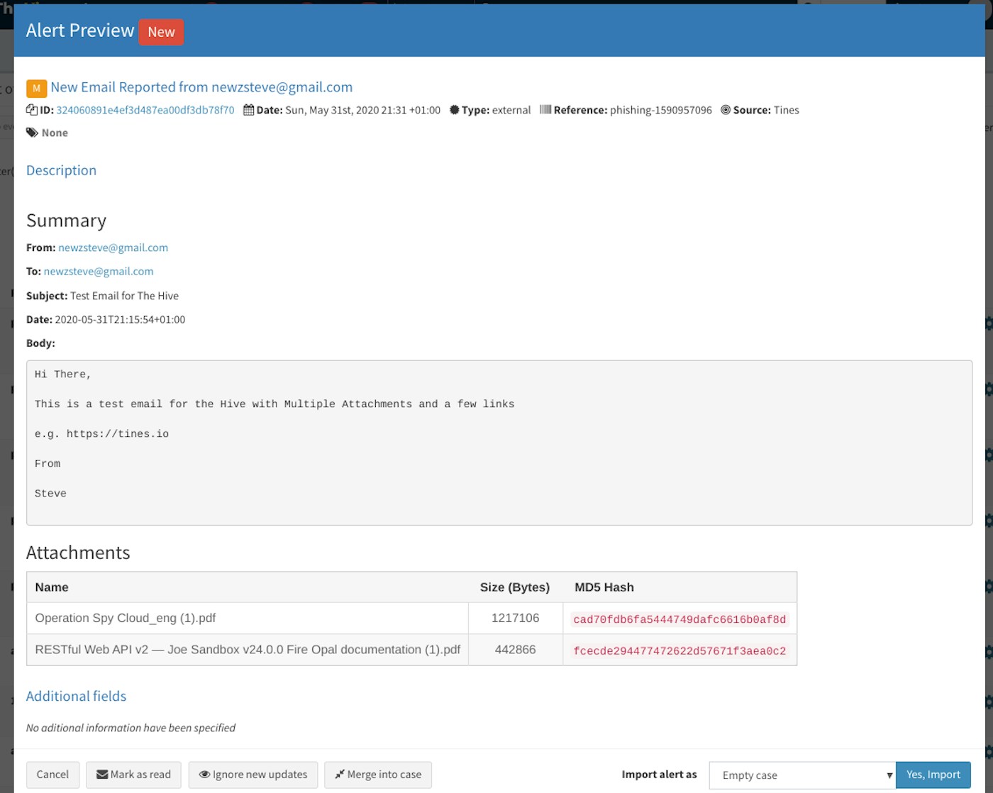 In the future, we’ll examine how to process some of these emails to automatically create a case in TheHive with an analysis of the attachments and URLs.