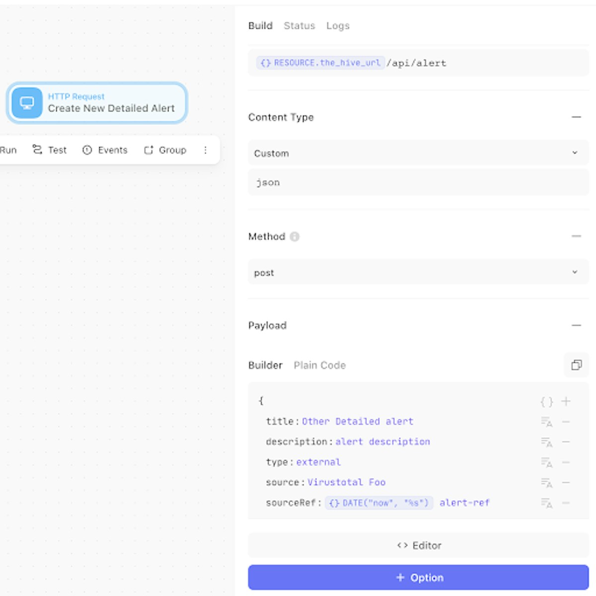 Similar to our curl command above, this will send an alert to the alert endpoint of your TheHive instance with a title, description, source, sourceref, together with headers. Edit the Action with some sample text that you think is appropriate.