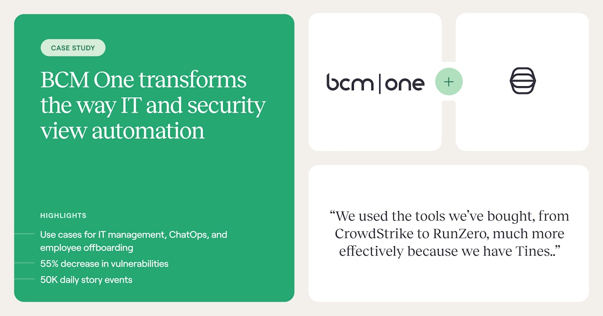 In the wake of a malware outbreak and insufficient Endpoint Detection Response (EDR), BCM One needed to reconstruct its security program from the ground up. Through their implementation of CrowdStrike, they discovered a high volume of vulnerabilities (1.1M) and a patching program that frequently missed SLA targets. Tines offered a flexible, scalable way to connect their relevant tools, and enhance and streamline vulnerability management.