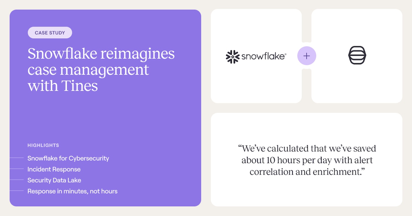 Security teams, including practitioners at Mars, McKesson, Snowflake, and Elastic use Tines workflows to operate more effectively, mitigate risk, and reduce tech debt to free up time and focus on the threats that matter.