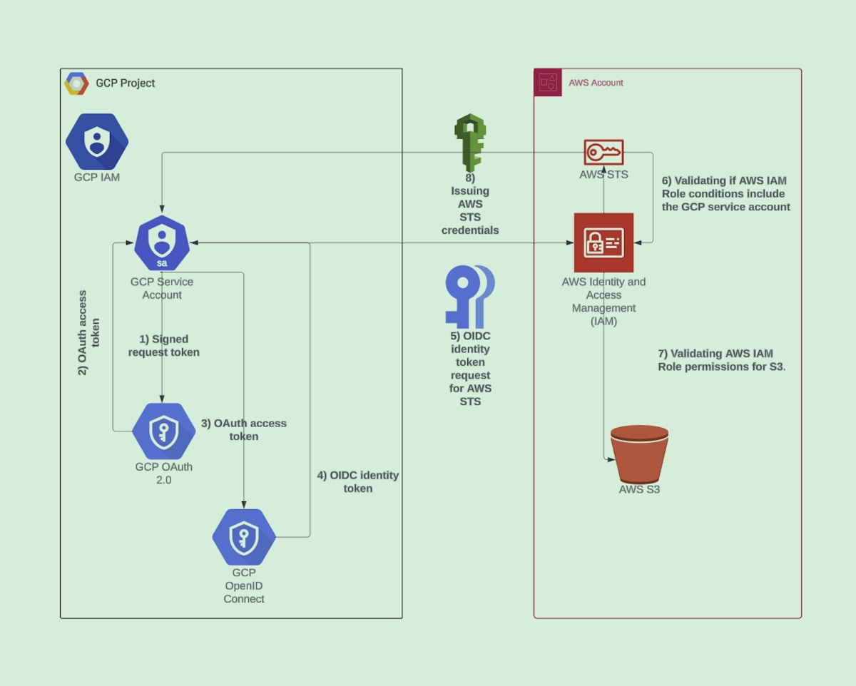 To get a better understanding, let’s pick one specific example, enabling a Google service account to list AWS S3 buckets without any static credentials.