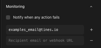 Tines has built-in monitoring at the story and action level. From the main story panel on the right, you can set to alert on any event failure in a story. This can be an email alert or a webhook action, giving you the ability to build a story that handles any action failure in any story.