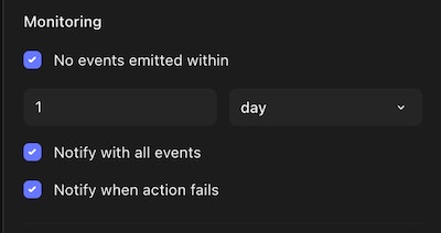 At the action level, under the “status” tab on the righthand pane, you have more options in terms of when alerts take place. This includes if no events are emitted in a given period of time or if any event is emitted, in addition to action failure.