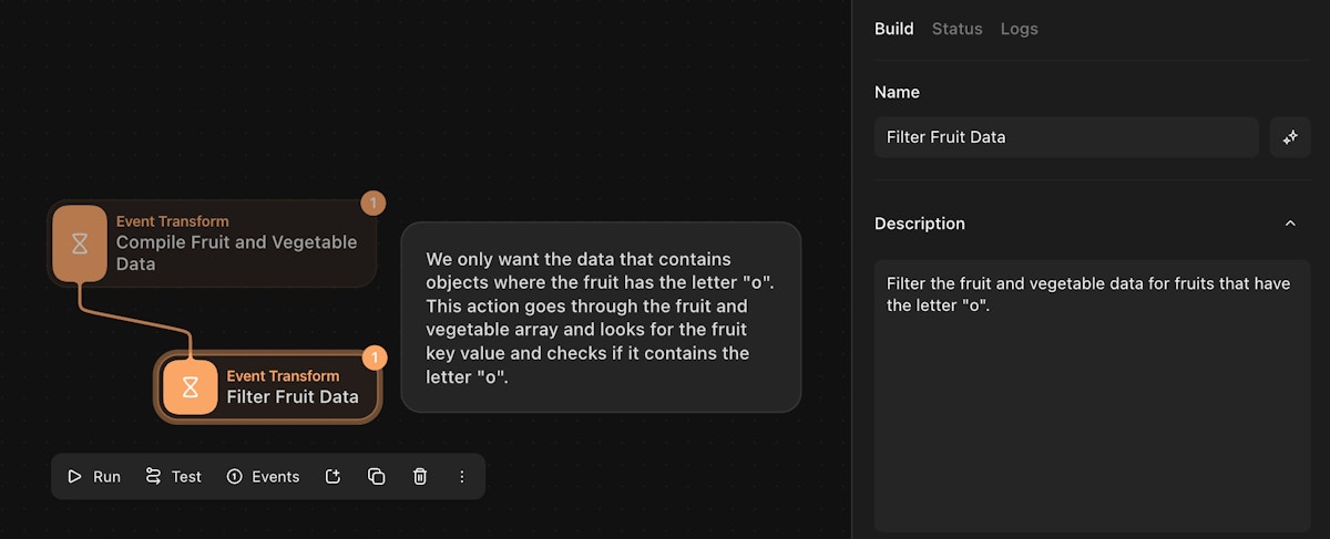 Tines makes it easy to nest functions together if you prefer to condense actions. This is done by either nesting the functions within parentheses or using the pipeline syntax (|>and % ). One other option is to leverage local values to perform upfront calculations. These methods do have downsides as it may make it harder for a person not involved in the building process to follow and understand that logic that is happening. The method that you choose is dependent on the audience of these stories.