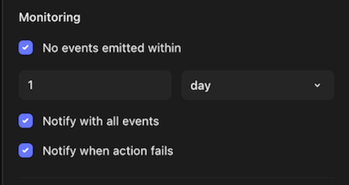 At the action level, under the “status” tab on the righthand pane, you have more options in terms of when alerts take place. This includes if no events are emitted in a given period of time or if any event is emitted, in addition to action failure.