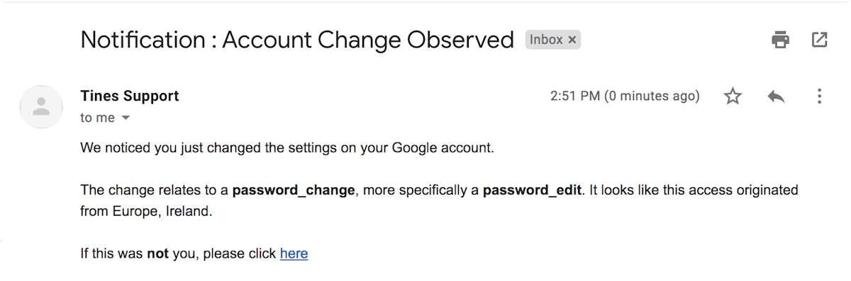 Tines: Email to a user to confirm or deny whether the recent account change was them.