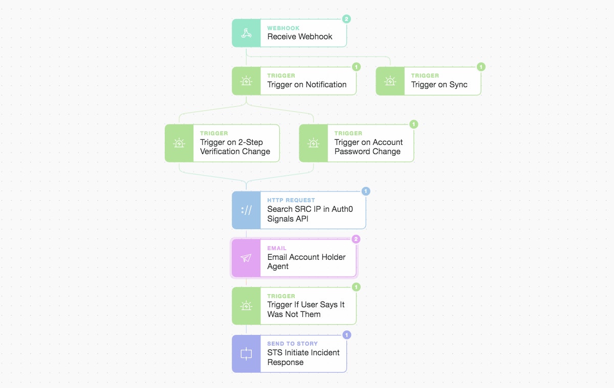 We now have an active subscription to the Reports API user_account events, and other than informational sync messages, we will receive all the data we need in the subsequent webhooks. It is from this entry point (our previous Webhook Action) that we can now make decisions about what to do next, be it for alerts, sending interactive user messages, or even to trigger other Actions or applications to perform related tasks for us. We can even chain our Story workflows together to make them more modular and easily reusable.