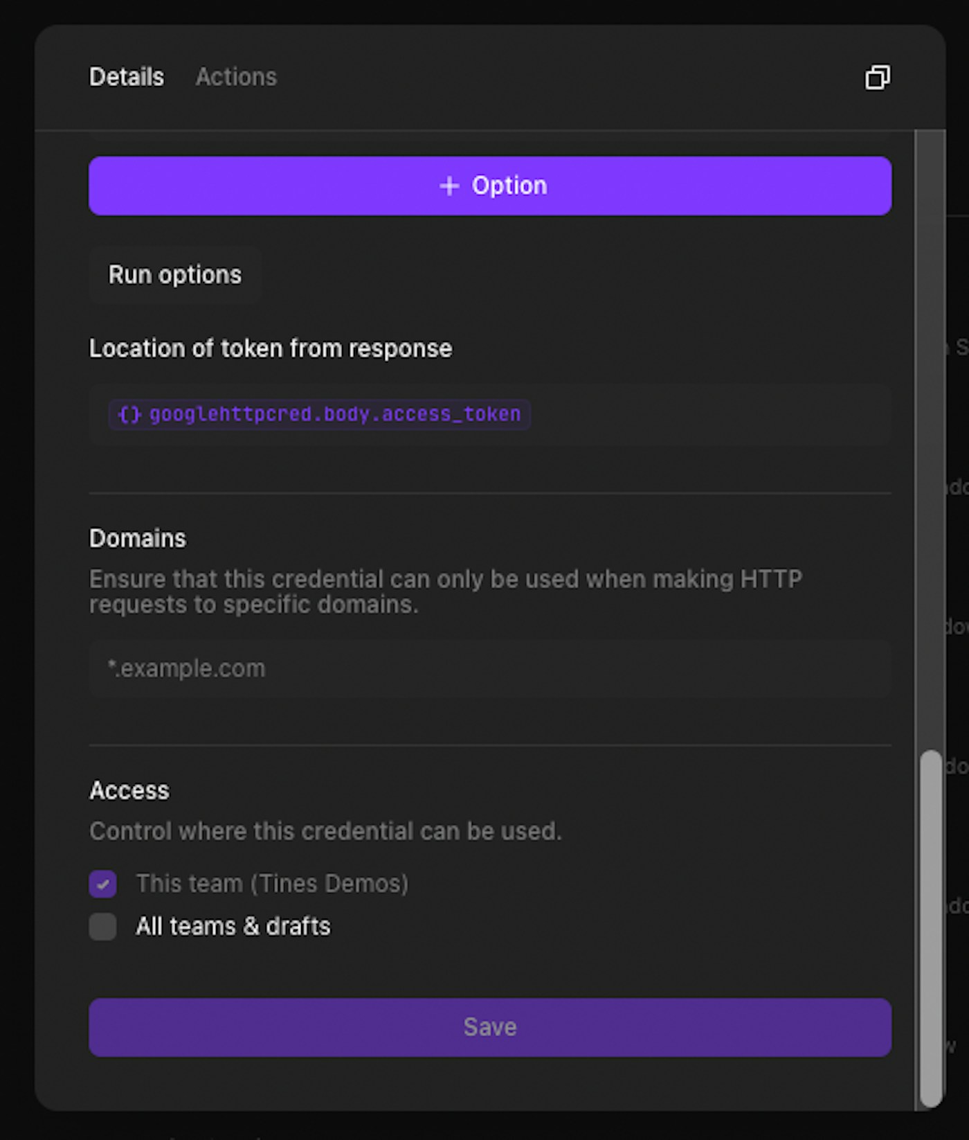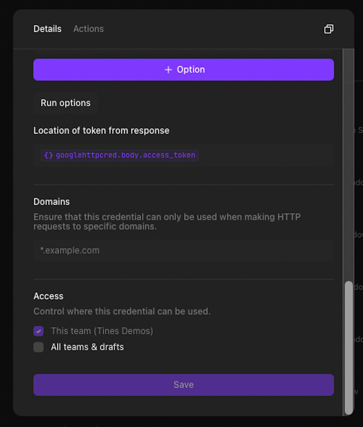 In Tines, go to “Credentials” and then “+ New Credentials” to create a new credential with the below details: